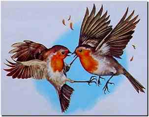 Par contre, elle s'accommodera fort bien de la présence d'autres espèces comme le pinson, la fauvette à tête noire ou la mésange bleue. Le rôle principal du chant est précisément de lui permettre de "marquer" les limites de fameux domaine: l'oiseau en fait le tour plusieurs fois par jour, en chantant à des postes bien particuliers, tel arbre ou arbuste, tel poteau électrique, tel fil barbelé etc... qui constituent en quelque sorte les frontières à ne pas franchir. Si un intrus se présente, les deux adversaires s'insultent longuement... en chantant! Ils ébouriffent leur plumage, prennent des airs féroces et s'envoient à la figure des choses que nous ne pouvons pas écrire ici car notre informateur, "la Hulotte", est un journal bien élevé. Jusqu'au moment où le plus impressionné des deux cède le terrain à son adversaire. Mais l'affaire peut tout aussi bien se terminer par une bagarre soignée se soldant dans certains cas par des blessures plus ou moins graves. |