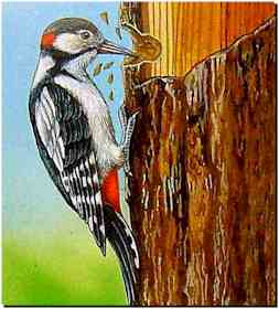 le bec légèrement entrouvert, il frappe à coups redoublés dans le tronc et en extrait de larges copeaux qu'il laisse tomber à terre. Le bruit occasionné par ce travail n'a rien à voir avec le "tambourinage" que nous évoquions tout à l'heure : il s'agit cette fois de coups laborieux, plus espacés et beaucoup moins sonores. |