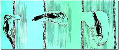 Parfois encore, il adopte un de ceux qu'il s'était amusé à forer durant l'hiver, comme ça, pour le plaisir... Voilà donc un oiseau qui, à l'instar du désormais célèbre poinçonneur des lilas, passe sa vie à faire des trous... Pour la plus grande joie des mésanges, torcols, sittelles, chevêches, étourneaux, moineaux et autres cavernicoles dont le bec n'est pas prévu pour la menuiserie et qui, providentiellement, trouvent là des logis fort convenables à des prix très compétitifs... Pour compenser l'usure consécutive à ses besognes journalières, le bec du pic repousse en permanence. On a calculé que sans cette usure, il pourrait atteindre une longueur de 75 cm ! |