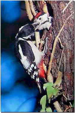 Pour se saisir de ces succulentes bestioles qu'il adore, surtout en larves, l'épeiche insinue sa longue langue vermiforme (c'est à dire en forme de vermicelle), à l'intérieur des trous creusés dans le bois par des insectes. |